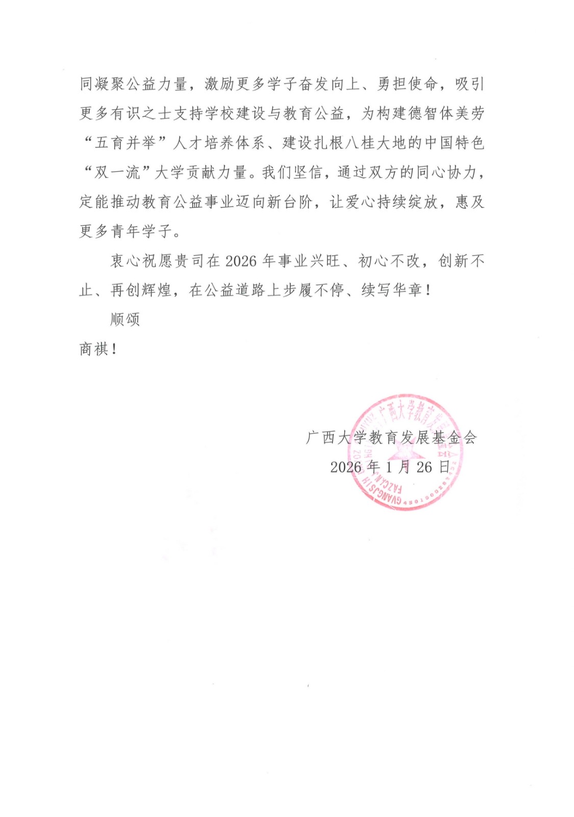 广西大学教育发展基金会在信中专门提及,2025年设立的“德信官网杯研究生学术论坛奖学金”已顺利发放66000元,资助了36名优秀学子,为他们安心求学、深耕学术提供了有力支撑。信中同时肯定,在公司及各方公益力量支持下,基金会运营管理持续优化,公益覆盖面与帮扶形式不断拓展。